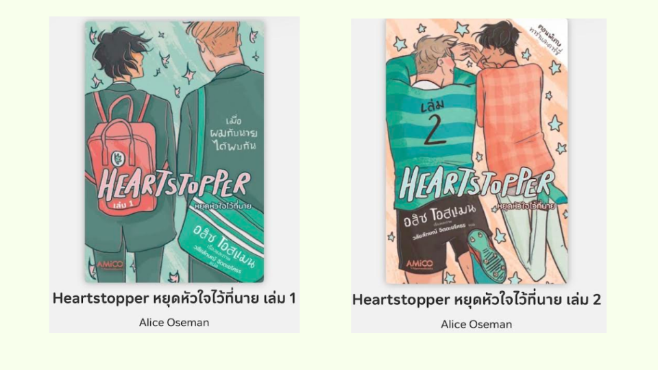 Heart Stopper (หยุดหัวใจไว้ที่นาย) เล่ม 1 และ 2 เรื่องและภาพโดย อลิซ โอสแมน แปลโดย วลัยลักษณ์ จิตตะยโศธร ทั้งสองเล่มให้คะแนน 4/5 ค่ะ